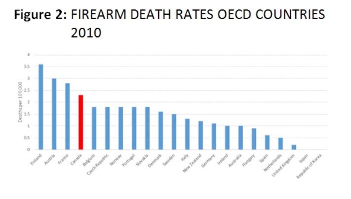 The firearm death rate (for all ages) in the United States (10.2/100,000) is much greater than in Canada (2.3/100,000).[3] However, it should not be assumed that a lower rate of firearm deaths in Canada means there is no problem. A study of firearm mortality rates in the United States and 22 other high income countries, using WHO data, showed that Canada ranked fifth overall in firearm death rate. To demonstrate important differences among the non-US countries, US data were removed from chart. When the US data are removed, Canada is seen to be fourth among the non-US countries in firearm mortality rates (Figure 2).