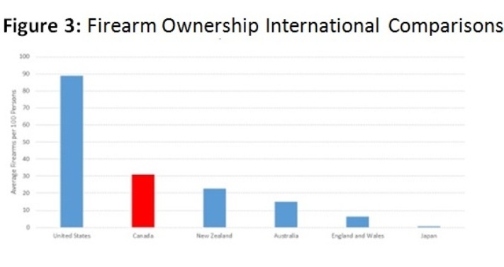 In the 2007 Small Arms Survey, Canada ranked 13th (out of 178 countries studied) for civilian firearm ownership (Figure 3). While the Canadian rate of guns owned/100 persons (30.8) is well below that of the United States (88.8), it exceeded those of New Zealand, Australia, England and Wales and Japan (0.6).[4]