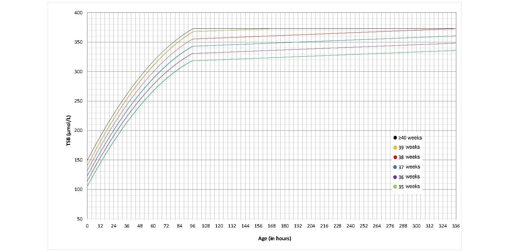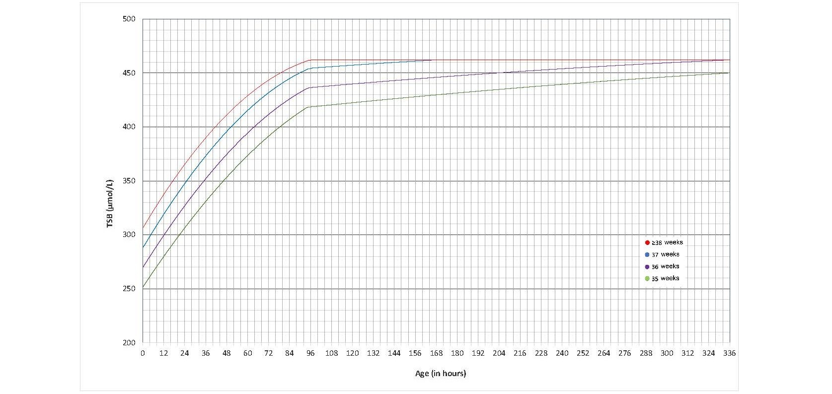 △TSB = Age(in hours)-specific phototherapy threshold - Measured TSB or TcB For example, a 24-hour-old infant born at 37 weeks gestation has a TSB screen of 150 µmol/L. The phototherapy threshold at 24 hours for this infant (per Figure 2) is 200 µmol/L. Therefore, the △TSB is 200 µmol/L - 150 µmol/L = 50 µmol/L. |