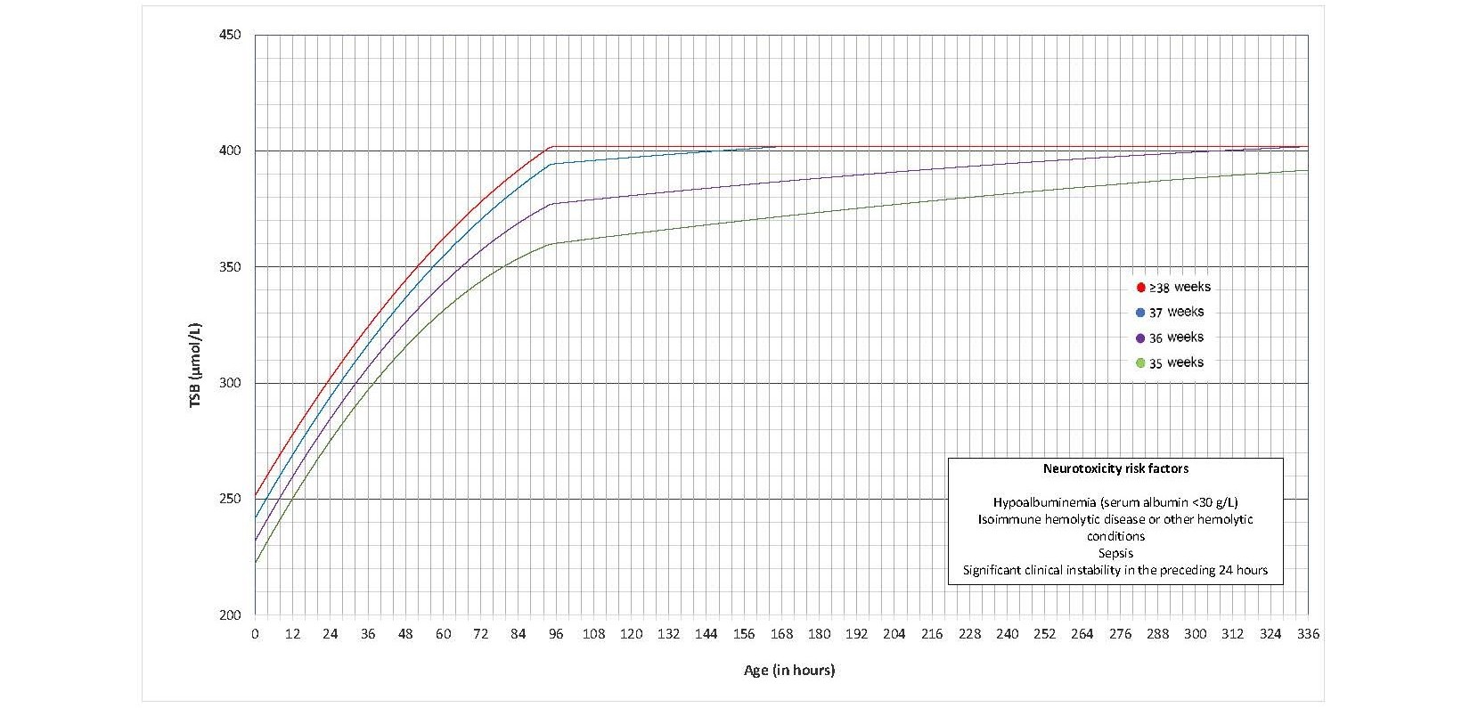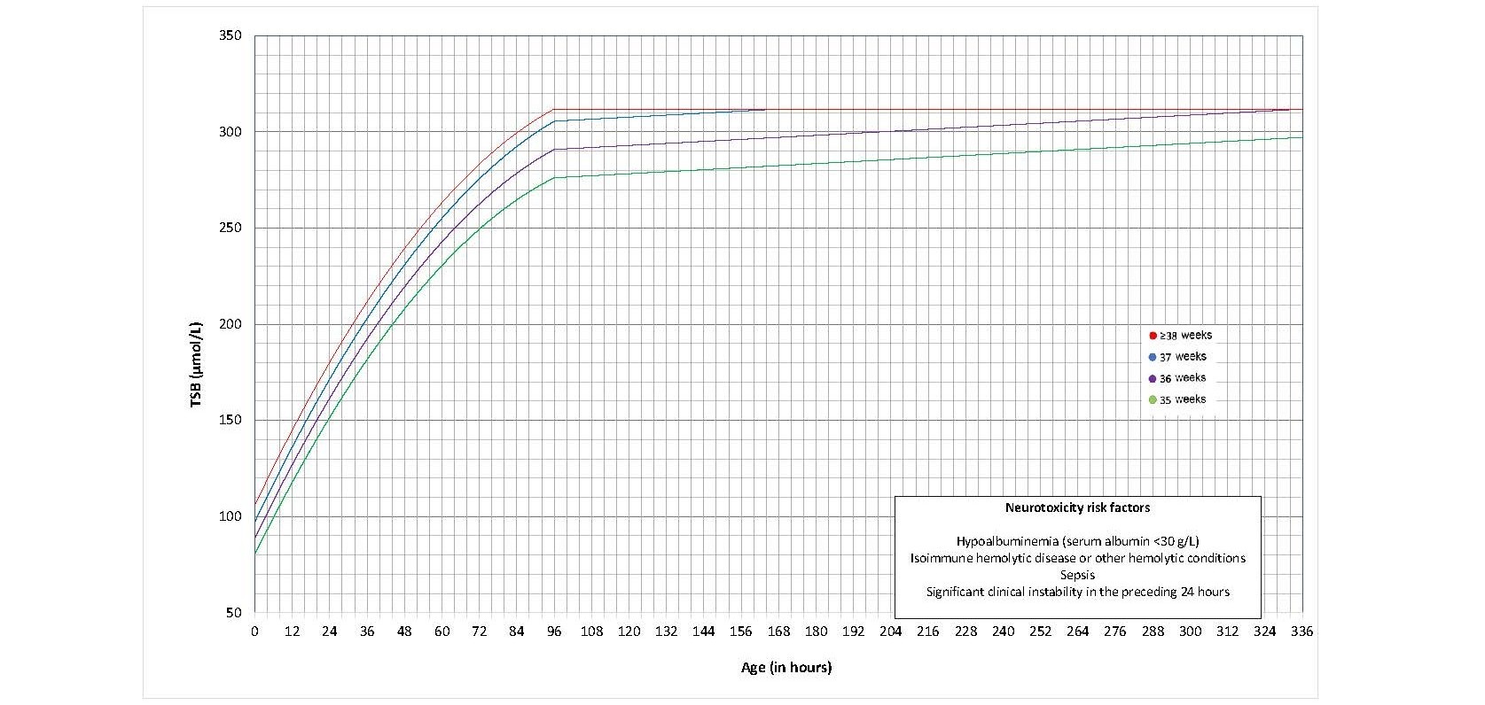 Determining neurotoxicity risk in a newborn requires clinical judgement. Some neurotoxicity risk factors are based on the hypothesis that the blood-brain barrier is compromised in newborns with a serious illness (e.g., sepsis[28][29]), which supports the use of lower TSB thresholds to initiate phototherapy and mitigate neurotoxicity risk. Similarly, hypoalbuminemia reduces bilirubin binding and may potentiate the neurotoxic effect of hyperbilirubinemia[30]. While there is insufficient evidence to recommend routine measurement of serum albumin in all newborns, this measure may be helpful for guiding management in seriously ill newborns or in those whose hyperbilirubinemia is severe (i.e., within reach of the pre-exchange transfusion threshold)[12].