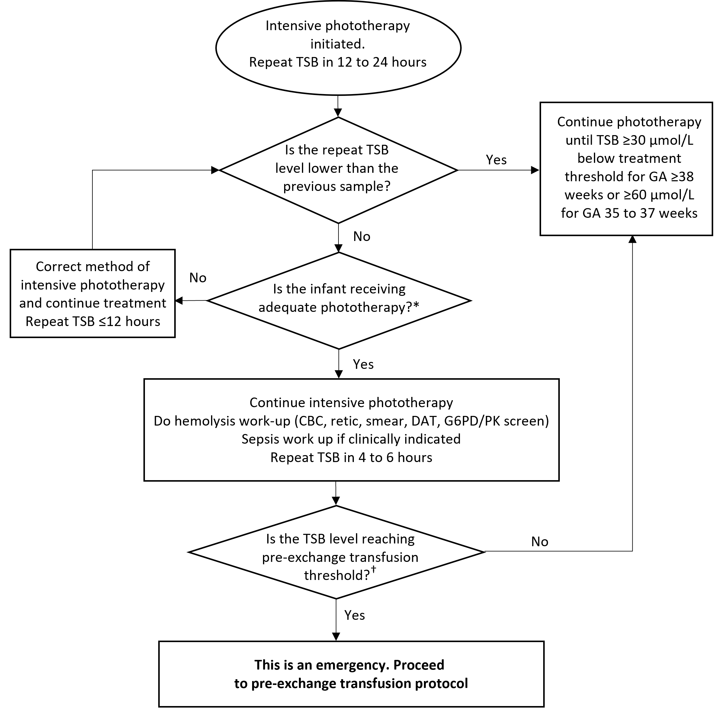 †Pre-exchange transfusion threshold is TSB ≤30 µmol/L of exchange transfusion threshold.