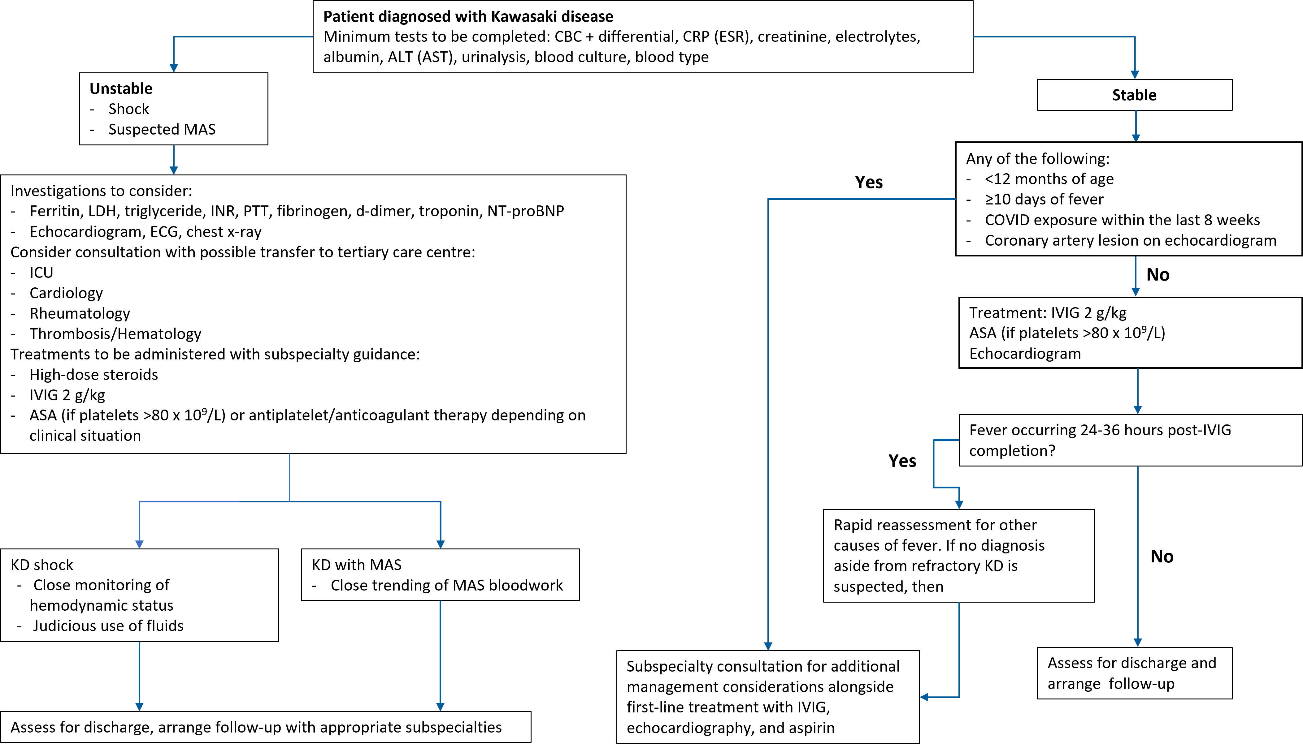 ALT Alanine transaminase; ASA Acetylsalicylic acid; AST Aspartate transaminase; CBC Complete blood count; COVID Coronavirus disease-19; CRP C-reactive protein; ECG Electrocardiogram; ESR Erythrocyte sedimentation rate; ICU Intensive care unit; INR International normalized ratio; IVIG Intravenous immunoglobulin; KD Kawasaki disease; LDH Lactate dehydrogenase; MAS Macrophage activation syndrome; NT-proBNP N-terminus pro beta natriuretic peptide; PTT Partial thromboplastin time