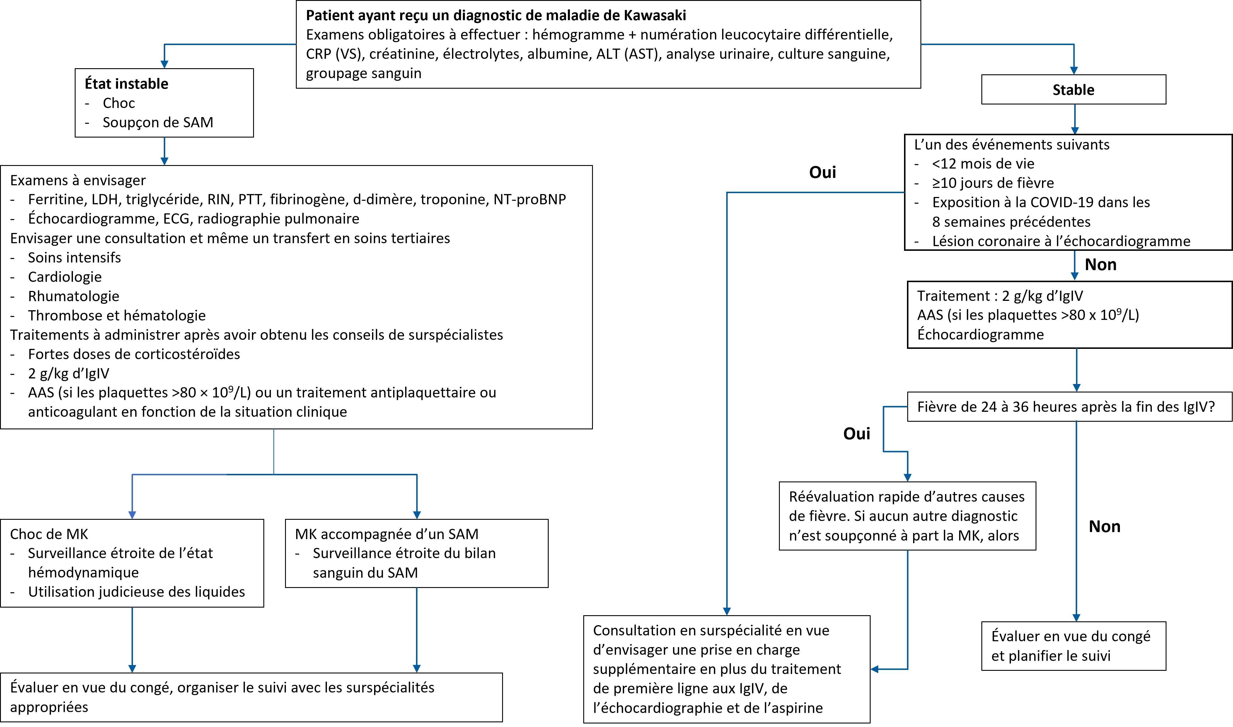 Figure 1. Algorithme pour l’évaluation et la prise en charge de la maladie de Kawasaki (examens facultatifs entre parenthèses)