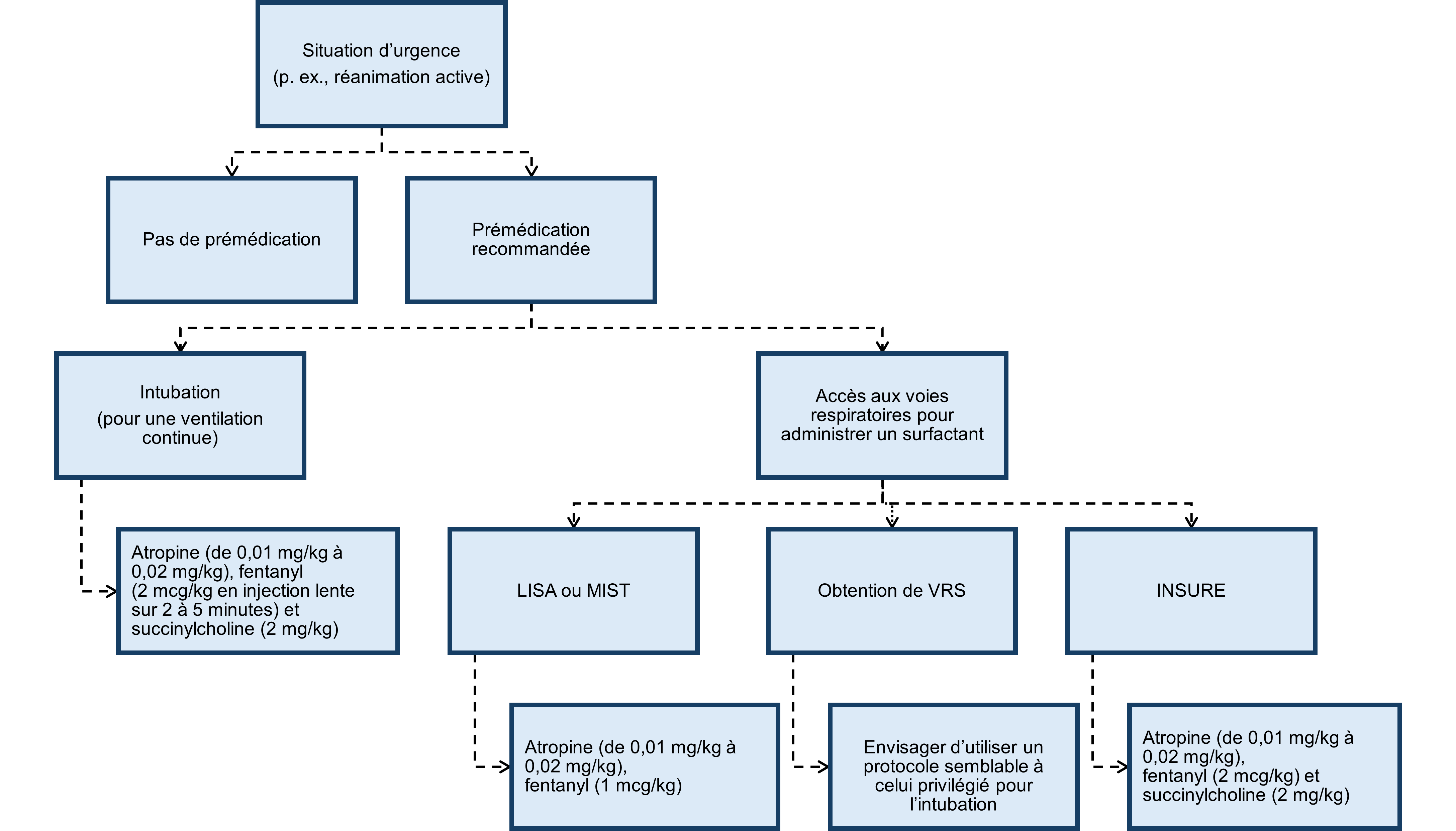 *Lorsqu’il est impossible d’obtenir un accès intraveineux, envisager d’administrer du fentanyl par voie intranasale à une dose de 1 mcg/kg à 2 mcg/kg. Il faut cependant tout mettre en œuvre pour prioriser l’accès intraveineux. **Un bolus rapide de soluté de chlorure de sodium à 9 % est à prévoir pour assurer la clairance du cathéter et de la tubulure, surtout lorsque les volumes administrés sont faibles. INSURE intuber-surfactant-extuber; LISA administration moins invasive de surfactant; MIST traitement mini-invasif au surfactant |