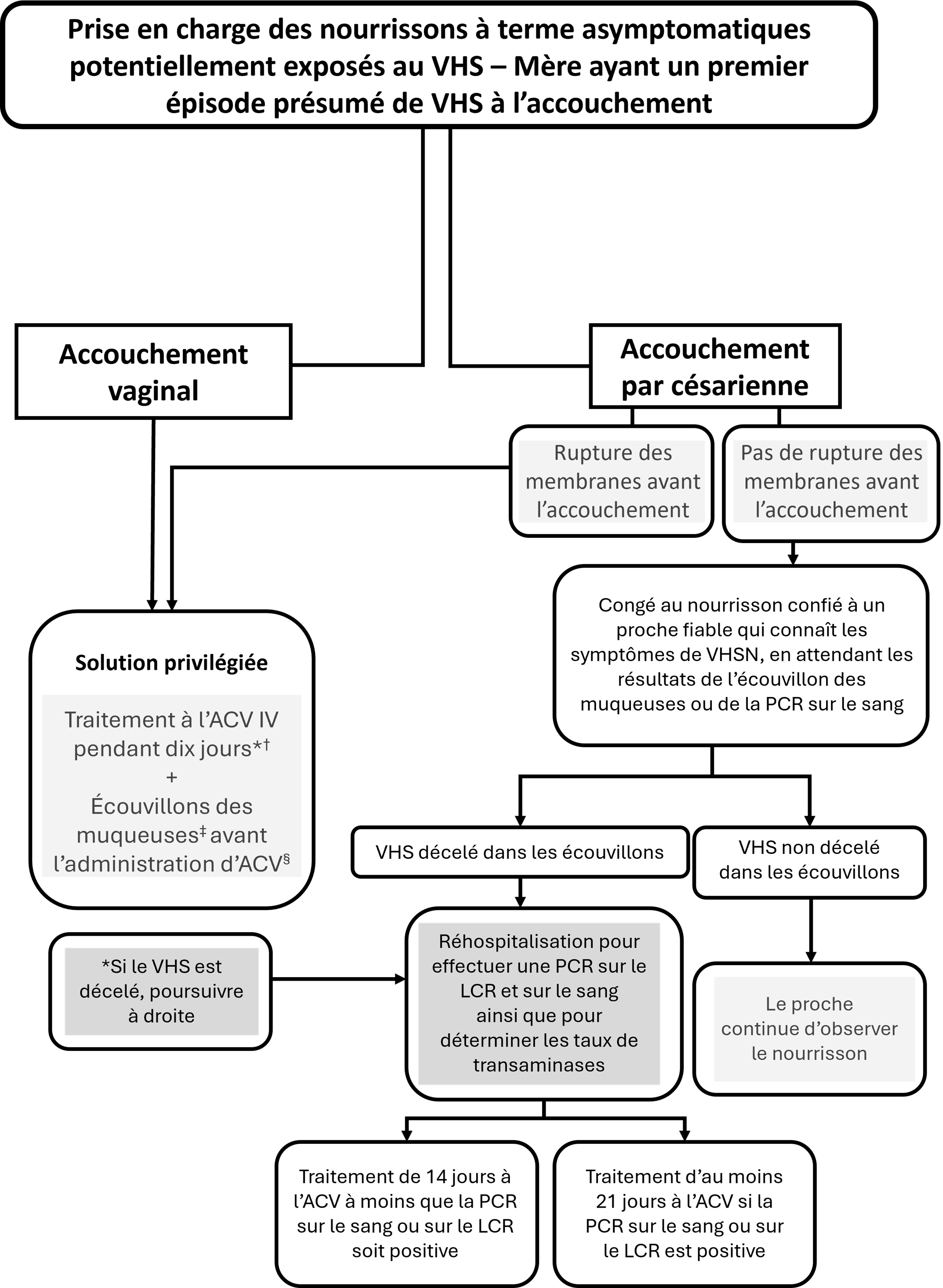 Il faut réaliser des écouvillons des muqueuses du nourrisson et commencer à lui administrer de l’ACV. La décision d’effectuer ce test à la naissance (malgré le risque de déceler une simple contamination de surface) ou à 24 heures de vie suscite la controverse. Certains experts recommandent également une PCR sur le sang, si elle est offerte. Chez le nourrisson, si les écouvillons ou la PCR sur le sang sont positifs, il faut obtenir une PCR sur le LCR pour déterminer la durée du traitement à l’ACV. Lorsque les écouvillons du nourrisson sont négatifs, le nourrisson devrait recevoir de l’ACV pendant dix jours.