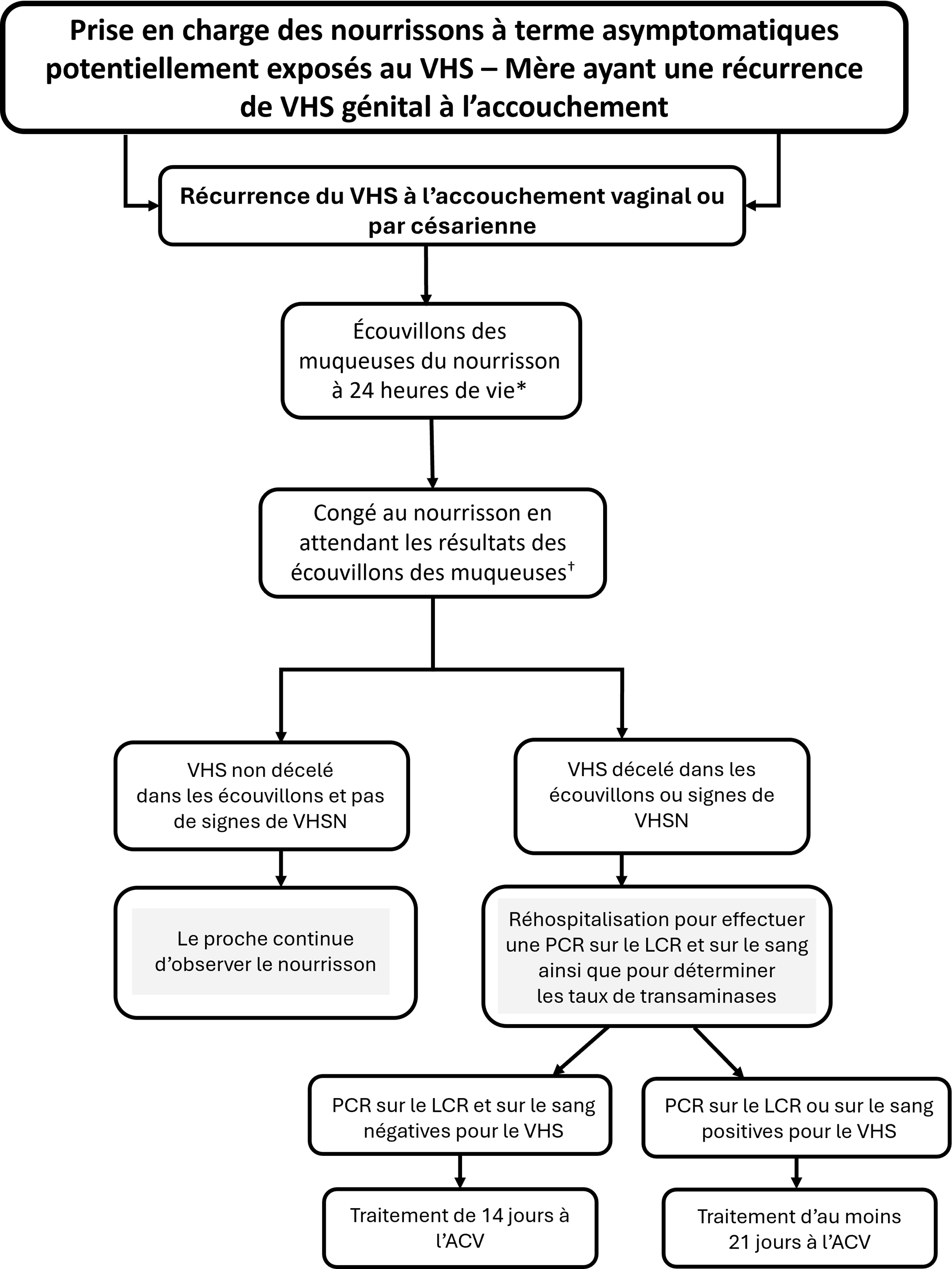 Le clinicien réalise un écouvillon des muqueuses à 24 heures de vie et peut accorder son congé au nourrisson en attendant les résultats. Certains experts recommandent également une PCR sur le sang, si le test est offert. Le traitement à l’ACV n’est indiqué que si les écouvillons ou la PCR sur le sang sont positifs ou si le nourrisson présente des signes ou symptômes d’infection par le VHSN.